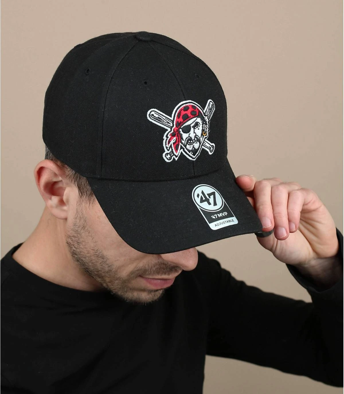 L’infâme pirate emblème de l’équipe de baseball des Pittsburgh Pirates dĂ©core l’avant de cette casquette noire Ă visière courbĂ©e de la marque ’47 sous forme d’un patch brodĂ©.