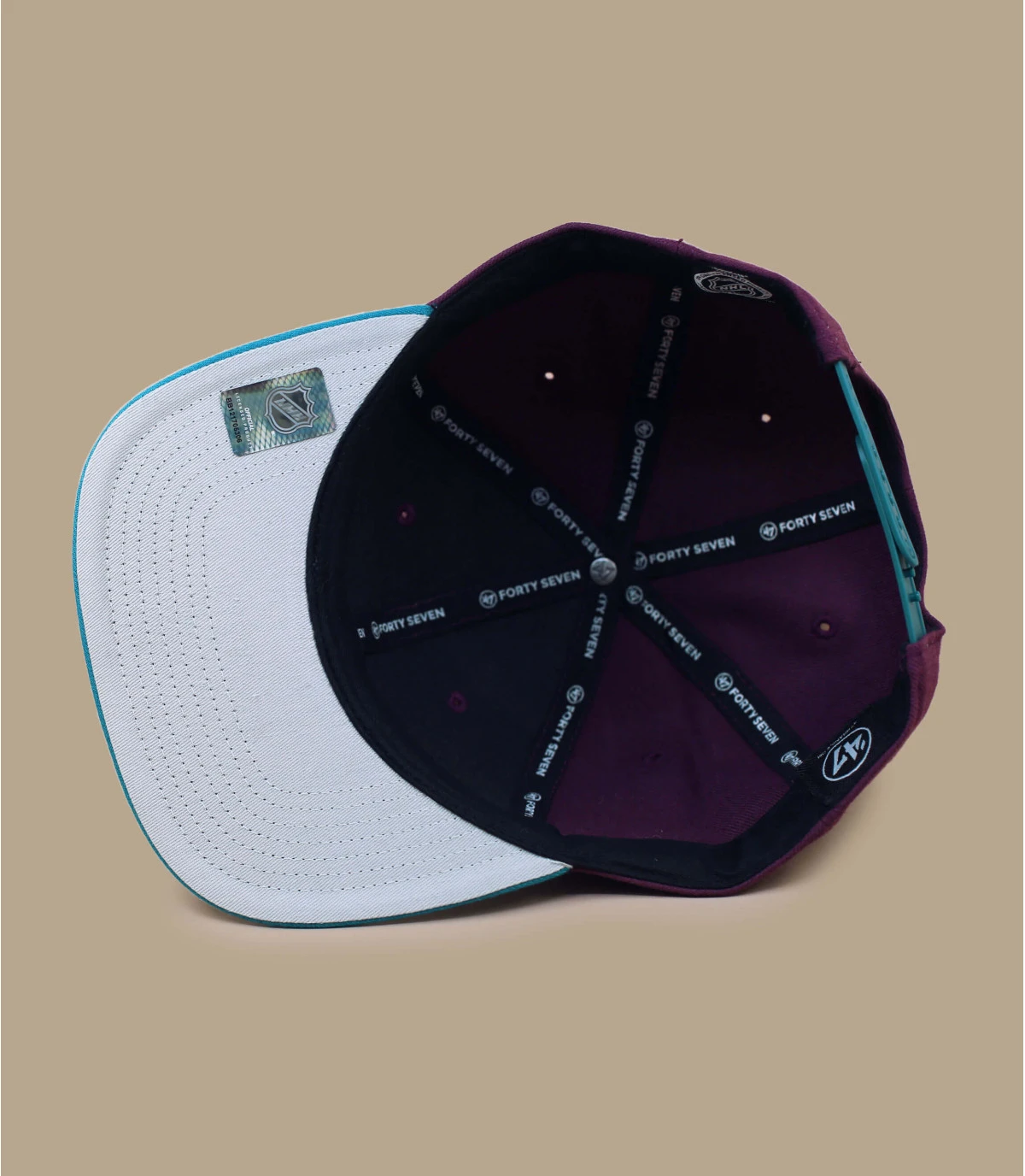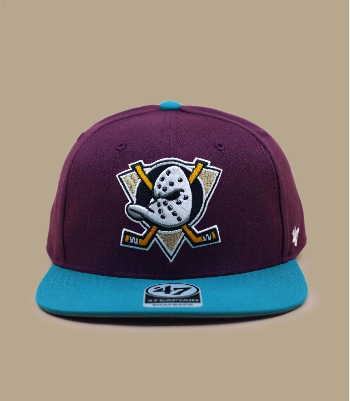 Soutenez les Ducks d’Anaheim avec une casquette snapback originale ! Elle est bordeaux avec une visière bleue, le logo de l’Ă©quipe apparaĂ®t Ă l’avant : un masque de gardien en forme de bec de canard et deux crosses Ă l’arrière.