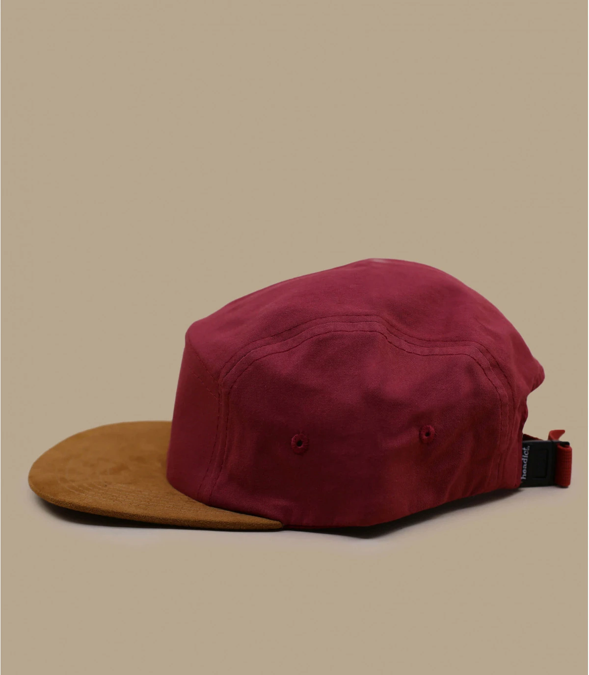 5 Panel bordeaux en coton washed avec visière suede marron. Attache réglable avec clip à l’arrière. Tour de tête 55-60 cm.