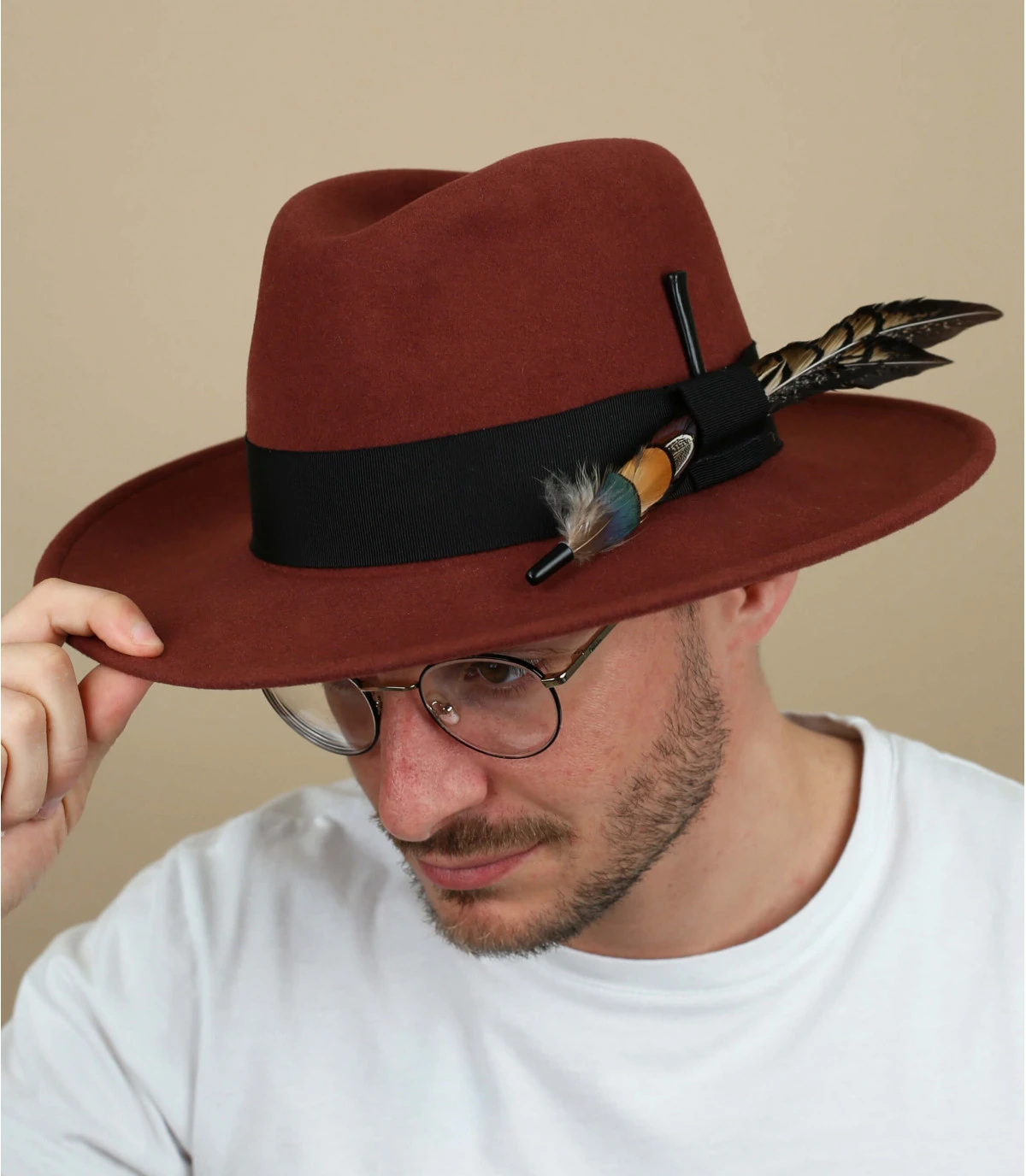Les créations du Californien Bailey sont toujours originales, comme ce magnifique chapeau élaboré aux États-Unis en feutre déperlant Litefelt®, relevé d’une grande plume et d’un clou en métal.
