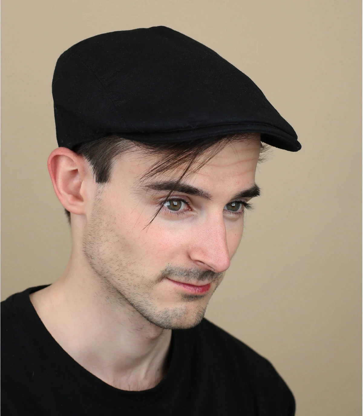 Le béret Bang est une casquette plate noire unie très facile à porter et élégante. Son tissu est 100 % lin et sa doublure 100 % coton. C’est un basique raffiné, et sa fabrication est certifiée sans produits toxiques ou nocifs pour la santé.