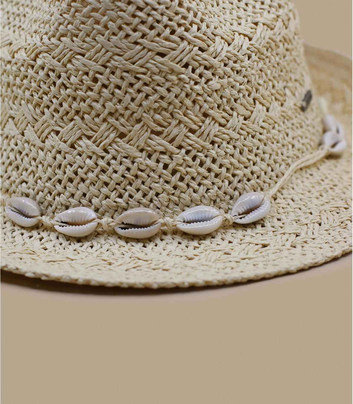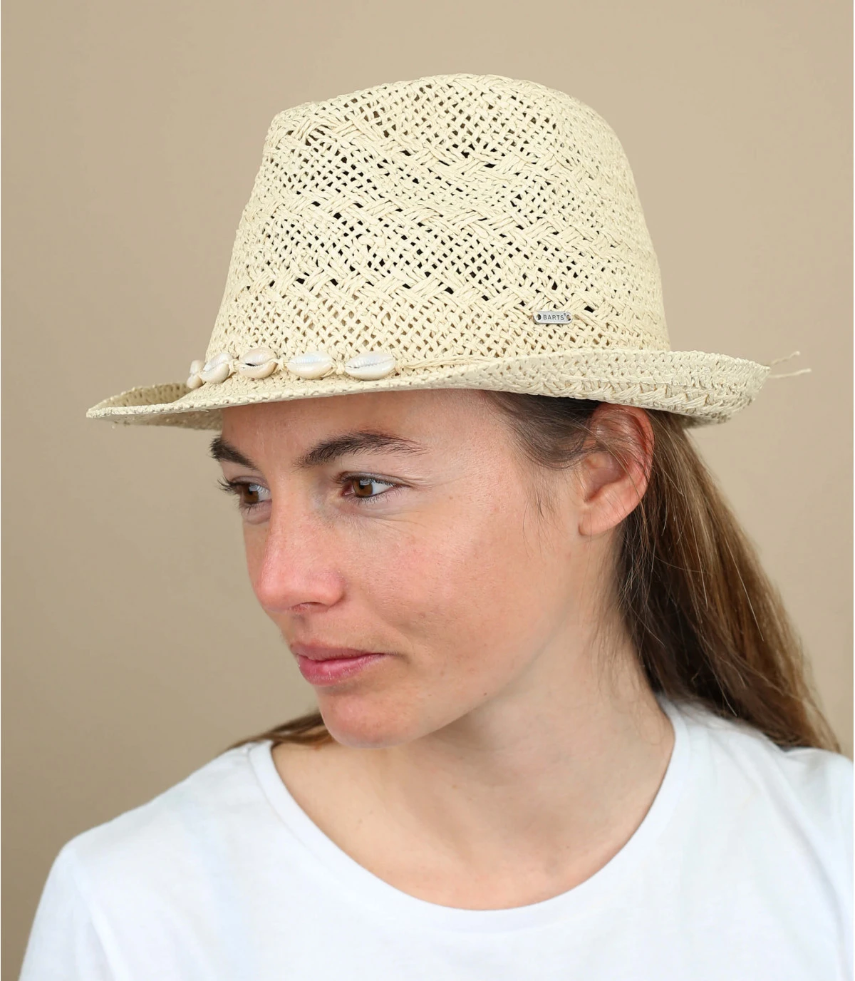 Pour avoir un look de sirène sur la plage, essayez ce chapeau trilby pour femme 100% paille de couleur beige. Il est décoré d’une lanière avec des coquillages et son tressage est aéré. Le nom de la marque Barts apparaît sur le côté gauche.