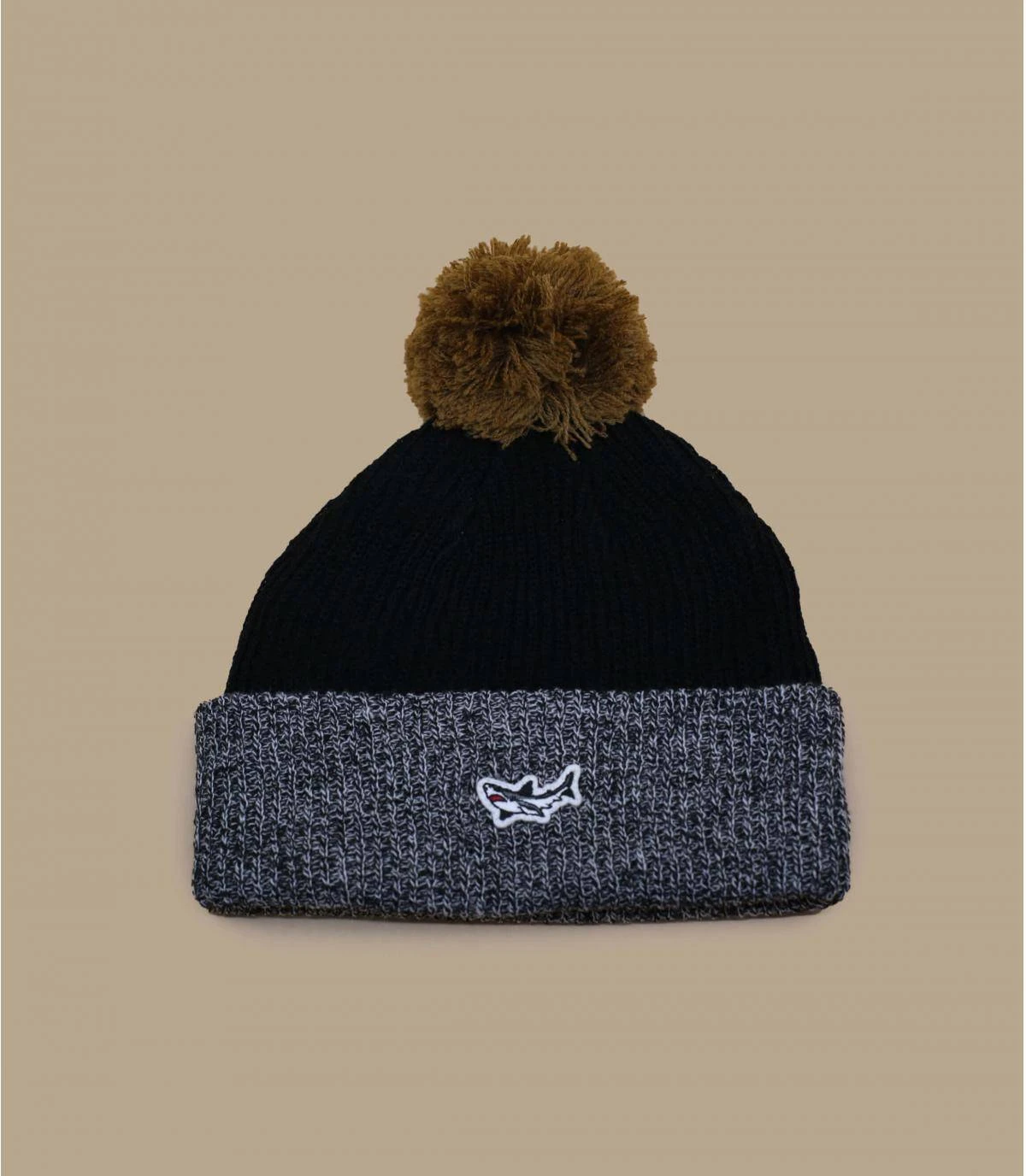Ce superbe bonnet à pompon dans des tons gris, noir et beige de la marque Dark Seas possède un grand revers qui le maintient bien en place et petit patch brodé de requin.