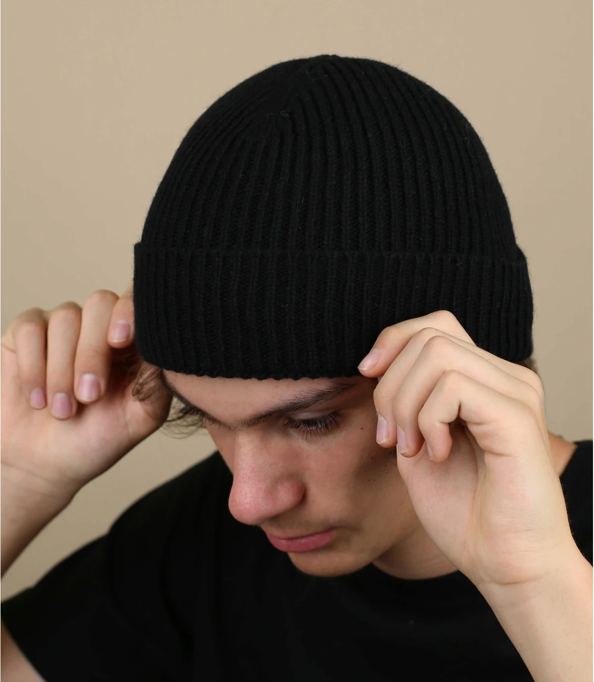 Bonnet en laine recyclée fabriqué en France de couleur noir. Taille unique : 55-60 cm de tour dre tête