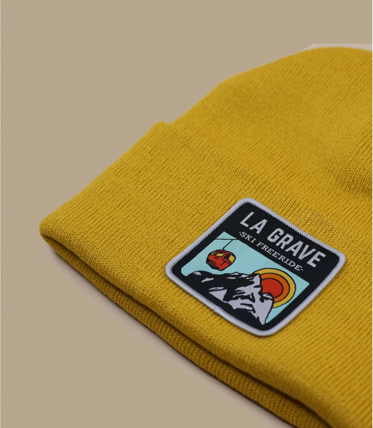 Le paradis des freeriders à un jet de télécabine… La Grave occupe une place spéciale dans l’esprit de tous les accros à la poudreuse, surtout de ceux qui y ont gouté un des bons jours… Bonnet brodé devant d’un superbe patch vintage sur fond jaune moutarde dans le cadre de la série spéciale « Ski Resorts ».