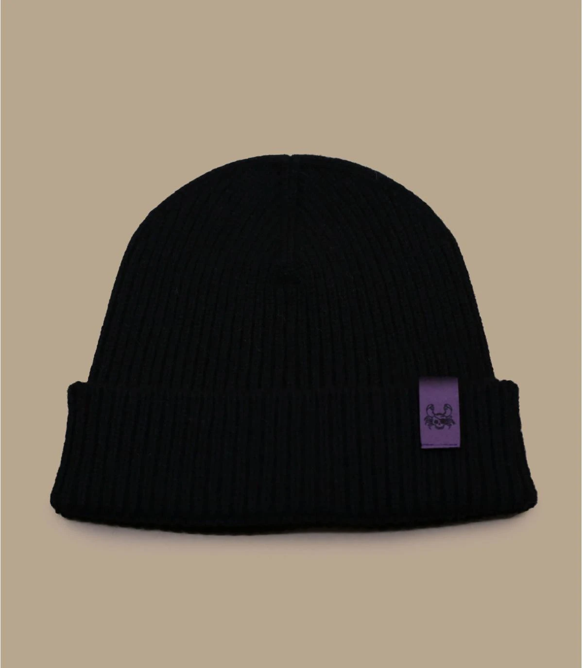 Bonnet en laine fabriqué en France dans la région Rhone Alpes et personnalisé dans notre Atelier d’Annecy, à partir de matières recyclées. Crabe pirate gravé sur patch violet.