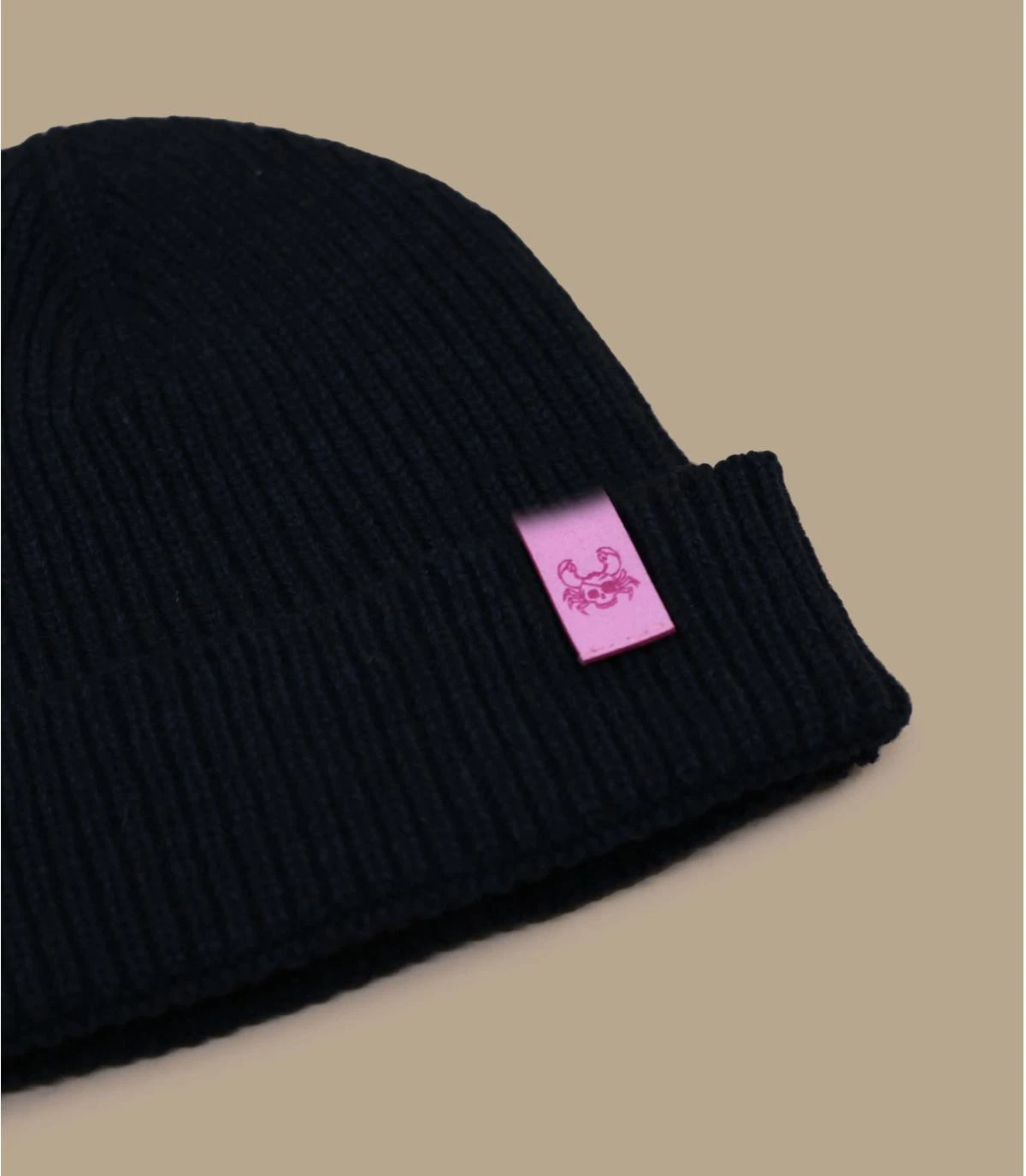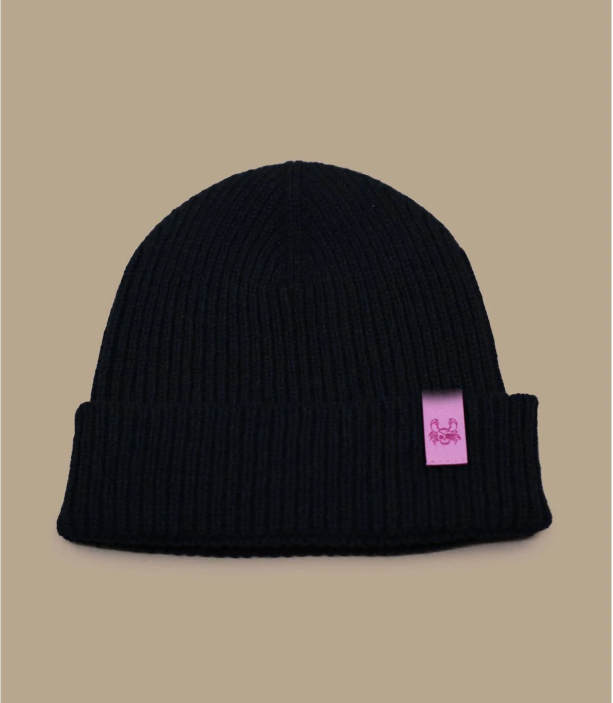 Bonnet en laine fabriqué en France dans la région Rhone Alpes et personnalisé dans notre Atelier d’Annecy, à partir de matières recyclées. Crabe pirate gravé sur patch rose.