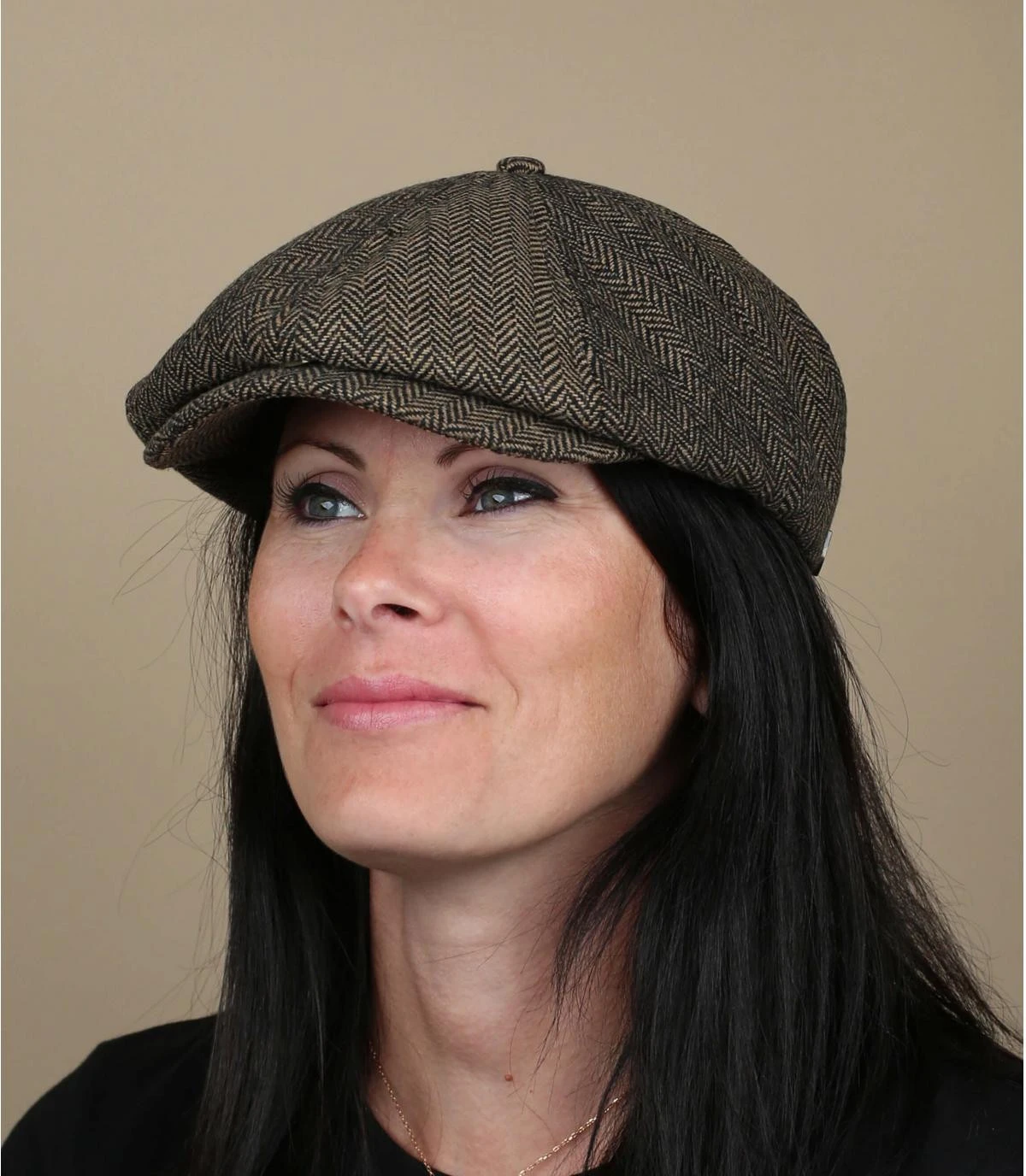 Béret style gavroche marron avec motifs à chevrons, pour femme. Visière plate rigide et bouton sur le haut du béret. Logo Brixton aposé sur l’arrière et doublure interne.