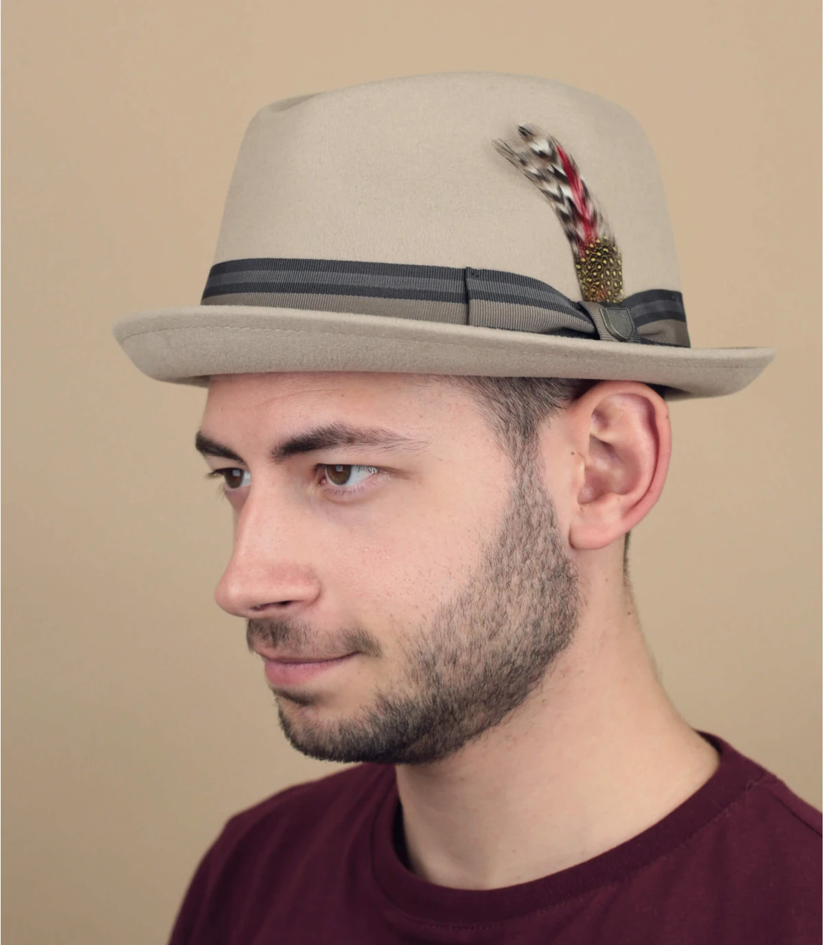 De coloris beige clair, ce chapeau est l’accessoire ultime pour compléter votre tenue rétro ou branchée. Il peut vous protéger de la pluie et du vent. Le bandeau coloré et la plume sont très chics.