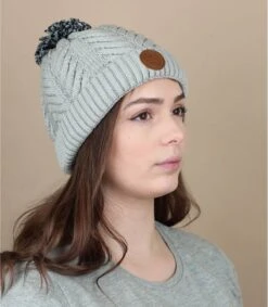 Très chic et pas trop chaud, grâce à sa matière douce en coton biologique, ce superbe bonnet gris affiche un effet de chevrons soigné, complété d’un joli patch rond en cuir et de trois pompons interchangeables.
