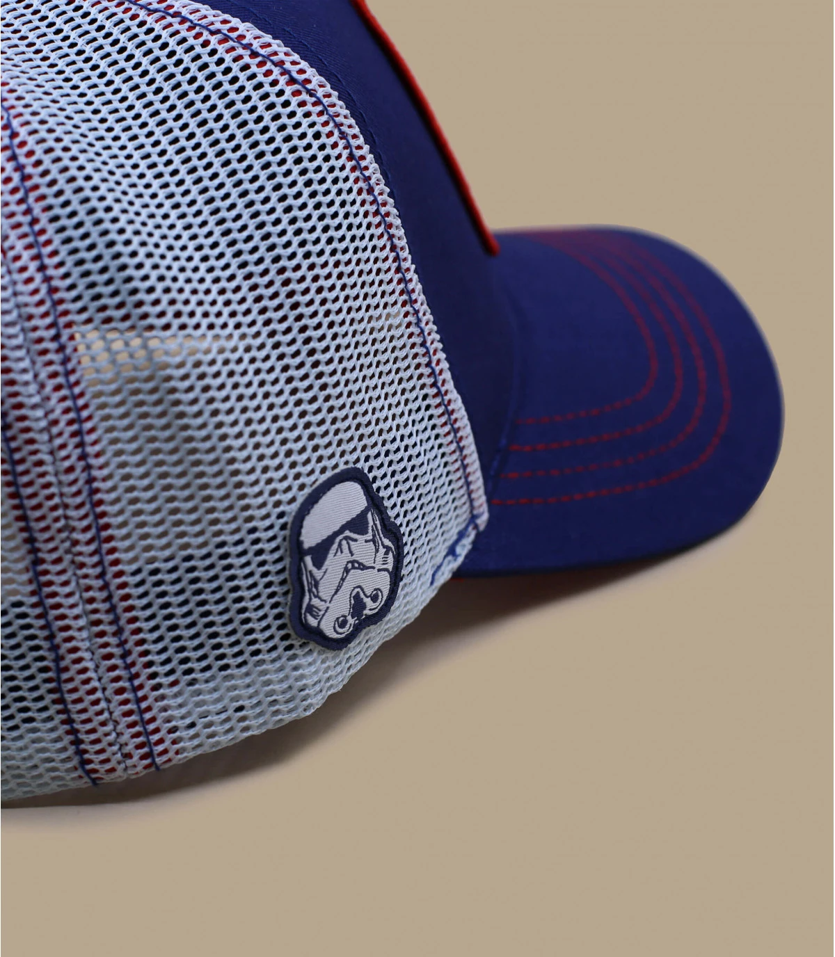 Cette magnifique casquette trucker bleue est relevée d’un patch affichant un soldat impérial Stormtrooper. Elle est complétée de détails soignés, comme un petit patch sur le côté et un dessous de visière rouge.