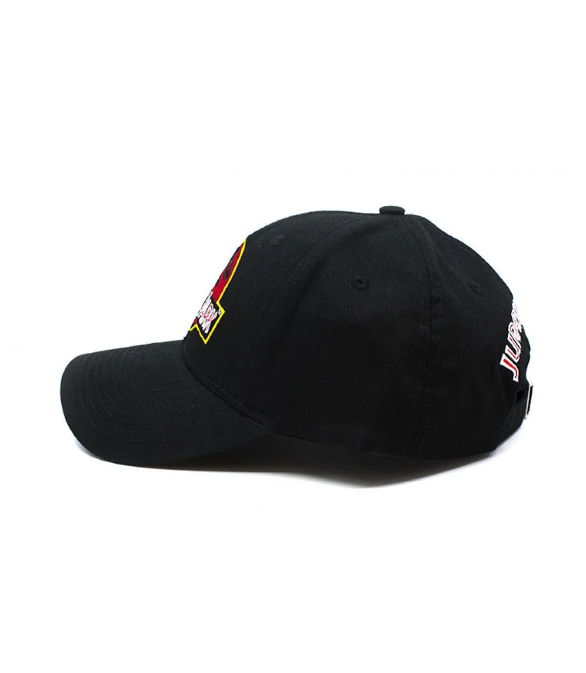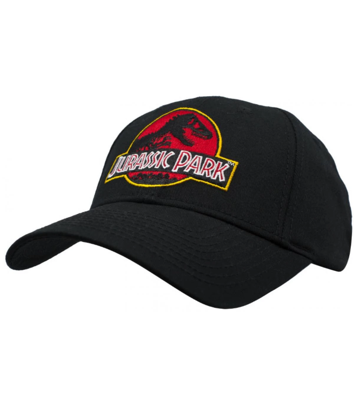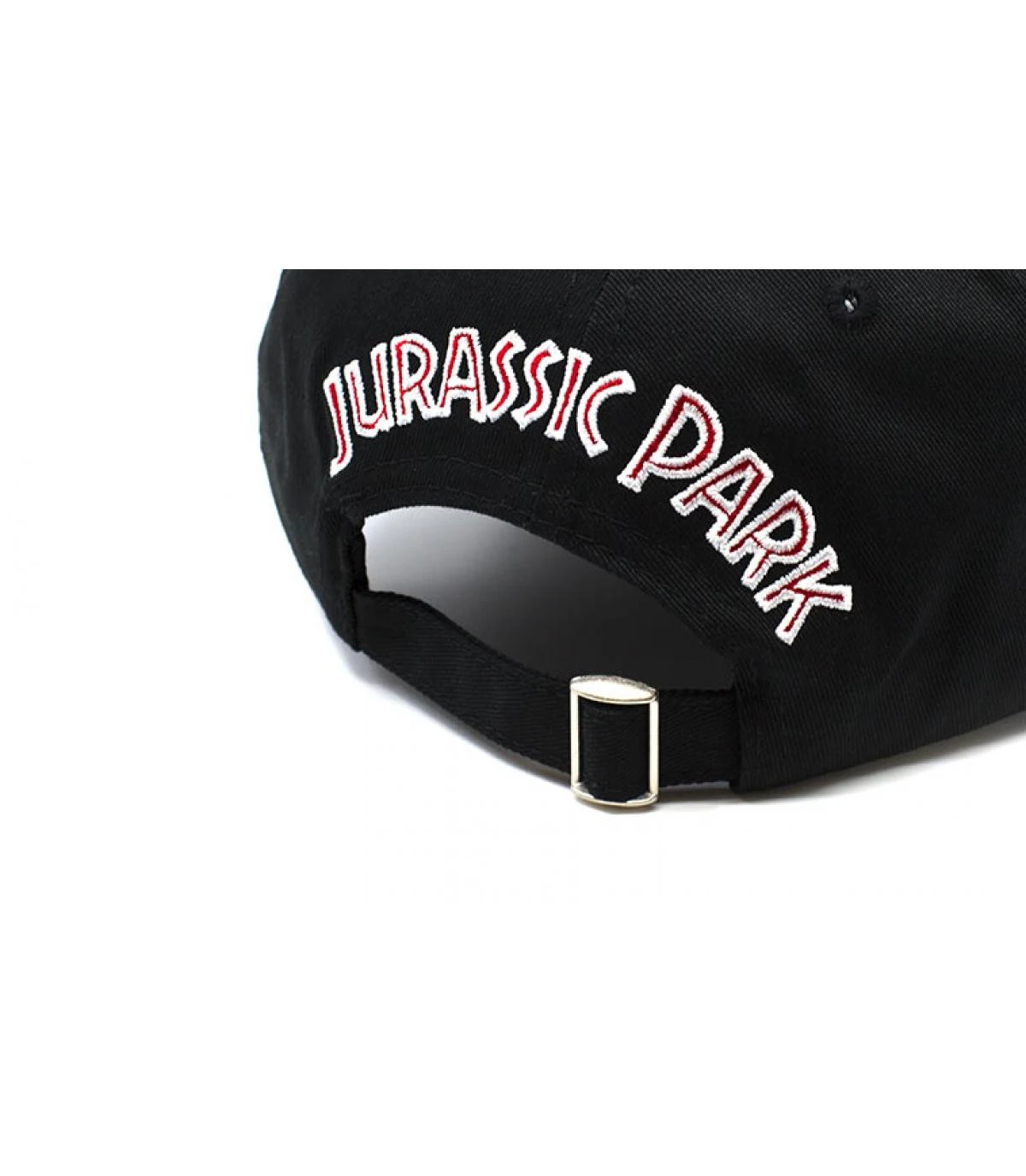 Casquette noire à visière courbée, brodée devant d’un grand patch rond au logo du film Jurassic Park, avec une silhouette menaçante de dinosaure sur fond rouge sang. Un grand classique pour ceux qui ont adoré avoir peur en regardant la saga de l’île aux dinosaures.