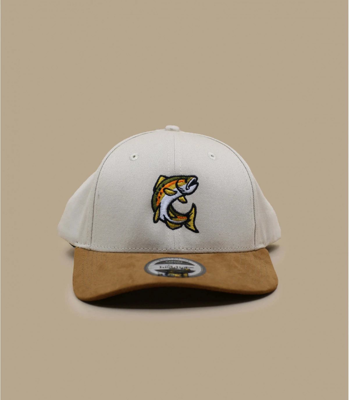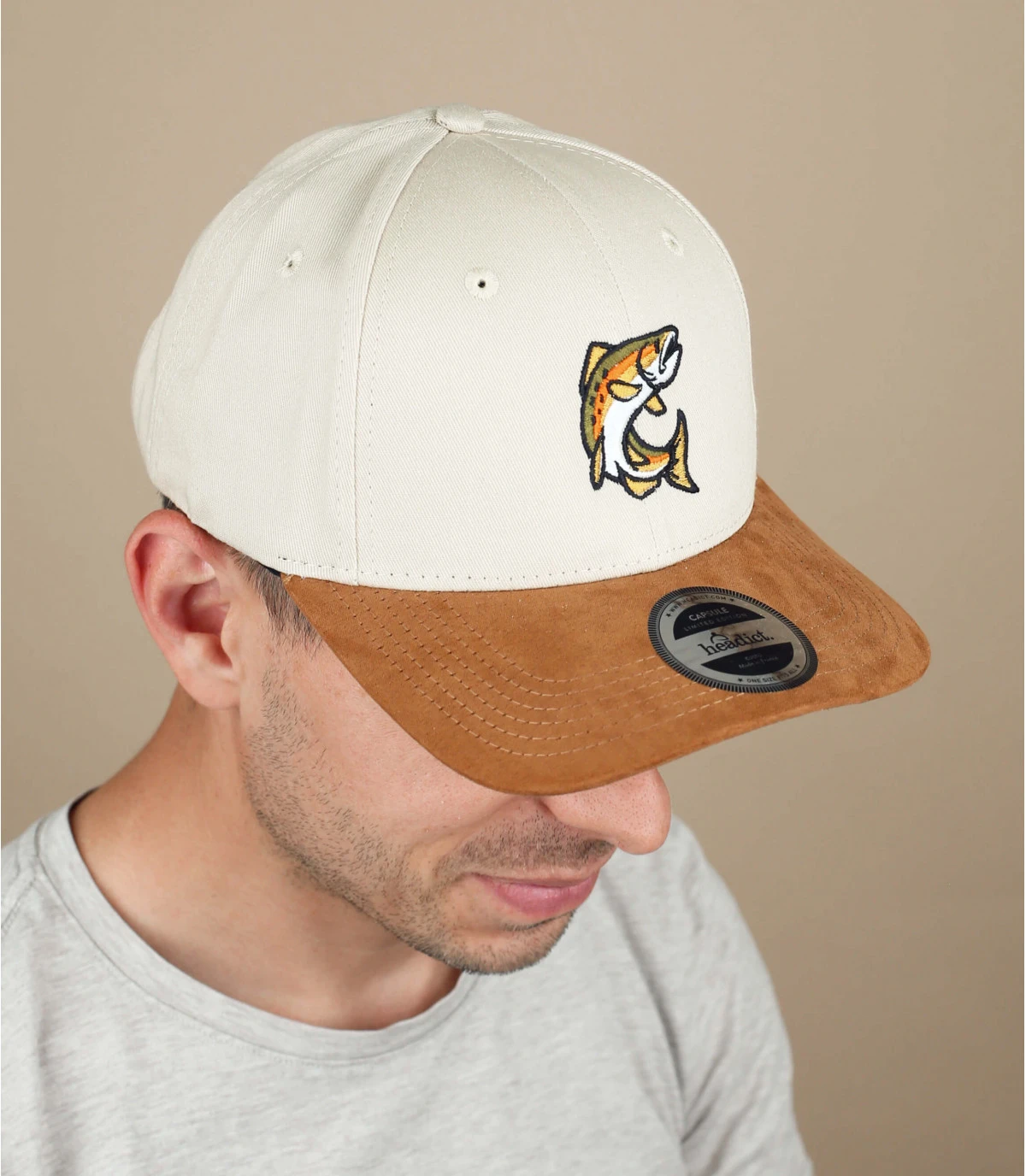 Casquette beige à visière courbée en cuir suédé, brodée sur le devant d’une superbe truite arc-en-ciel aux écailles colorées. Un modèle qui plaira à tous ceux qui aiment la pêche. Il leur permettra de communiquer leur passion à leur entourage et se protéger du soleil pendant les heures passées à attendre que le poisson morde.