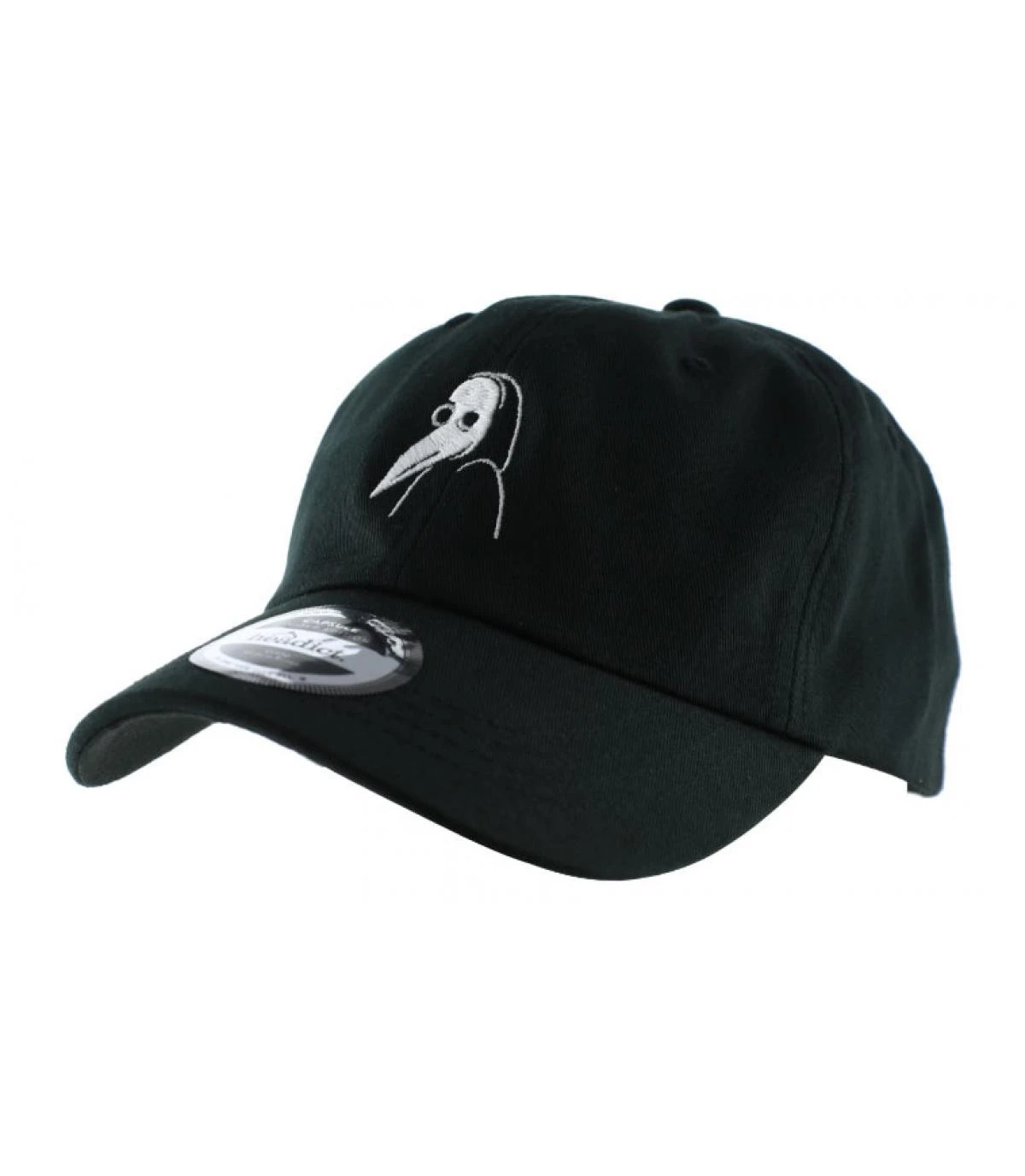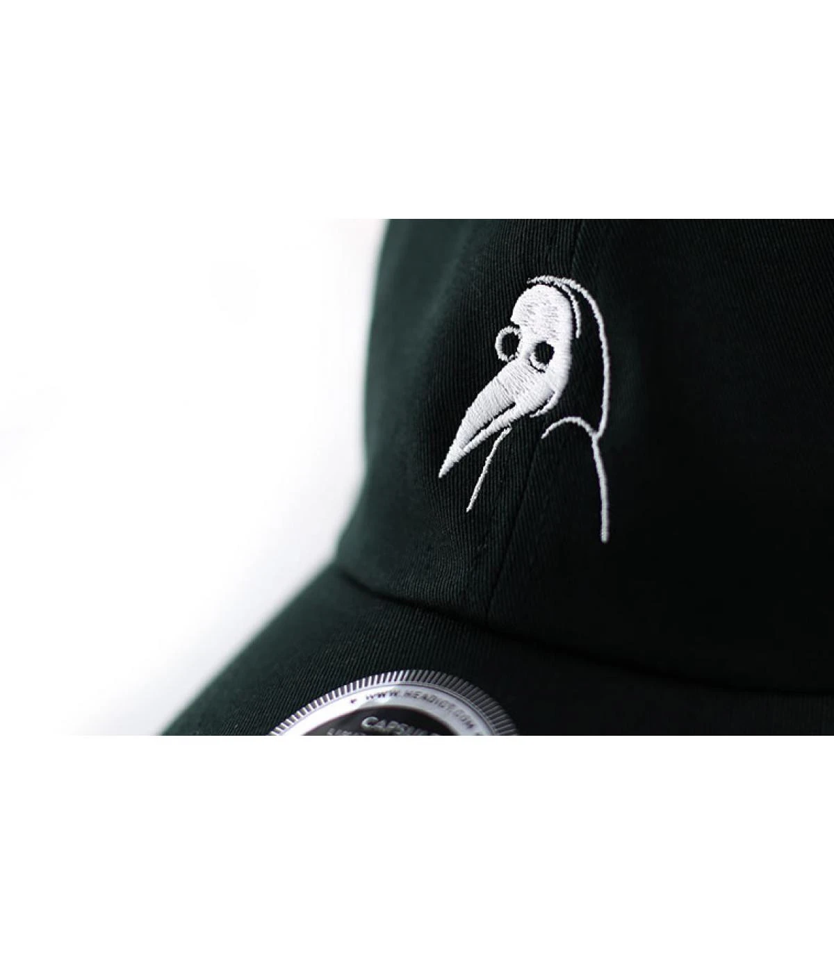 Avec leur masque bourré d’herbes aromatiques les protégeant des miasmes de la peste, les médecins du moyen âge rappellent les oiseaux de mauvais augure. Le graphiste Morte nous interpelle avec ce dessin brodé en blanc sur une casquette noire de la collection exclusive développée avec Headict.