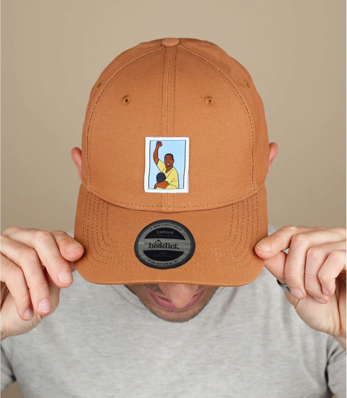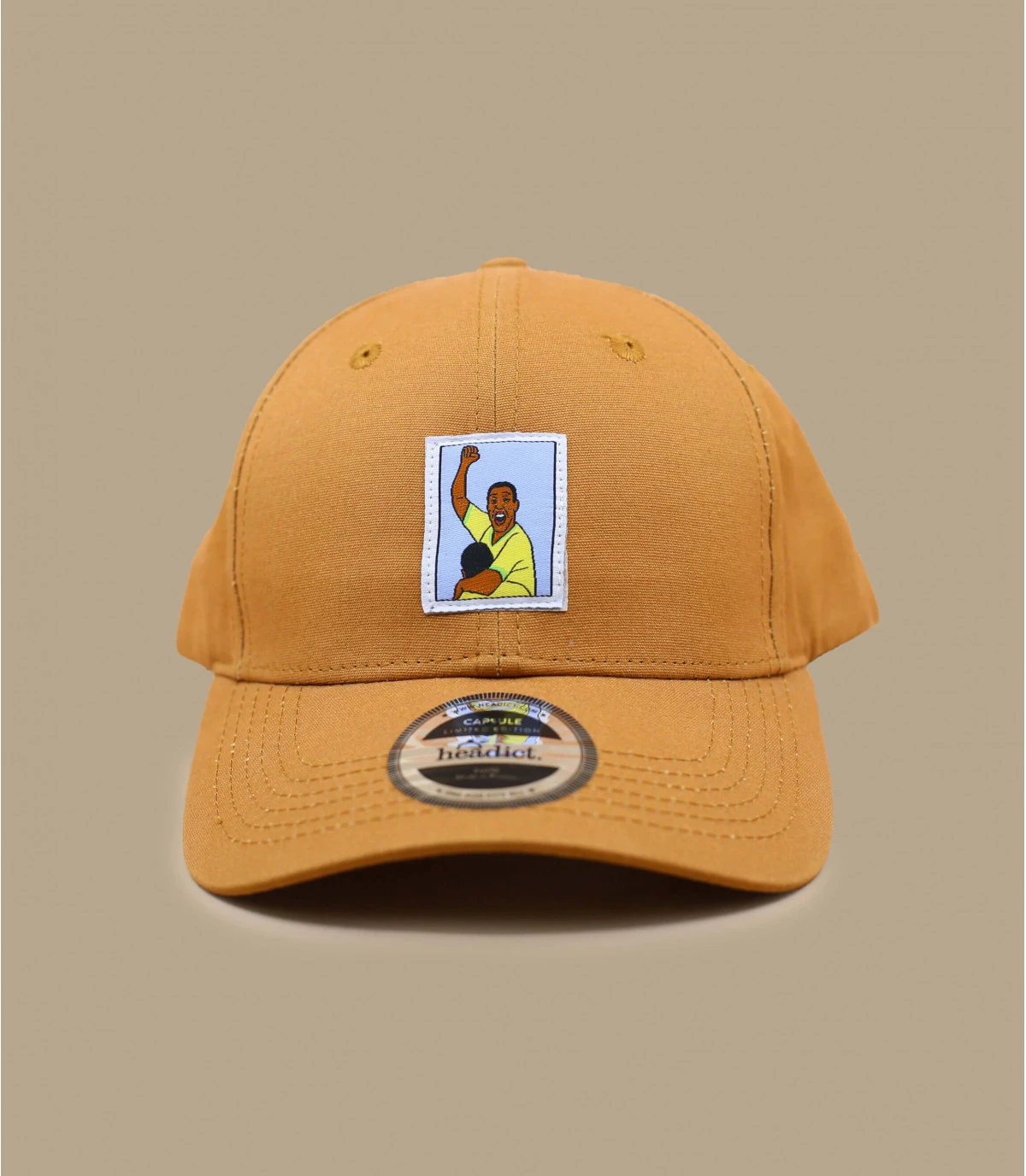 Les amateurs de moments iconiques de l’histoire du football seront comblés par cette casquette beige à visière courbée. Son patch tissé dessiné en exclusivité pour Headict présente l’explosion de joie du seul footballeur a avoir remporté trois championnats du monde à trois reprises avec le Brésil.