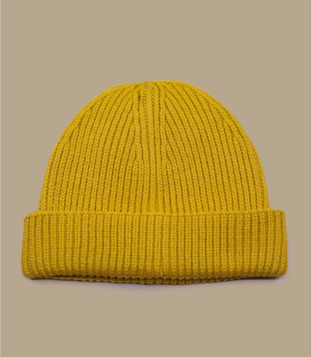 Bonnet docker de couleur moutarde couvrant uniquement le haut des oreilles. Matière mi polyester recyclé mi acrylique. Taille unique : 55-60 cm de tour de tête.