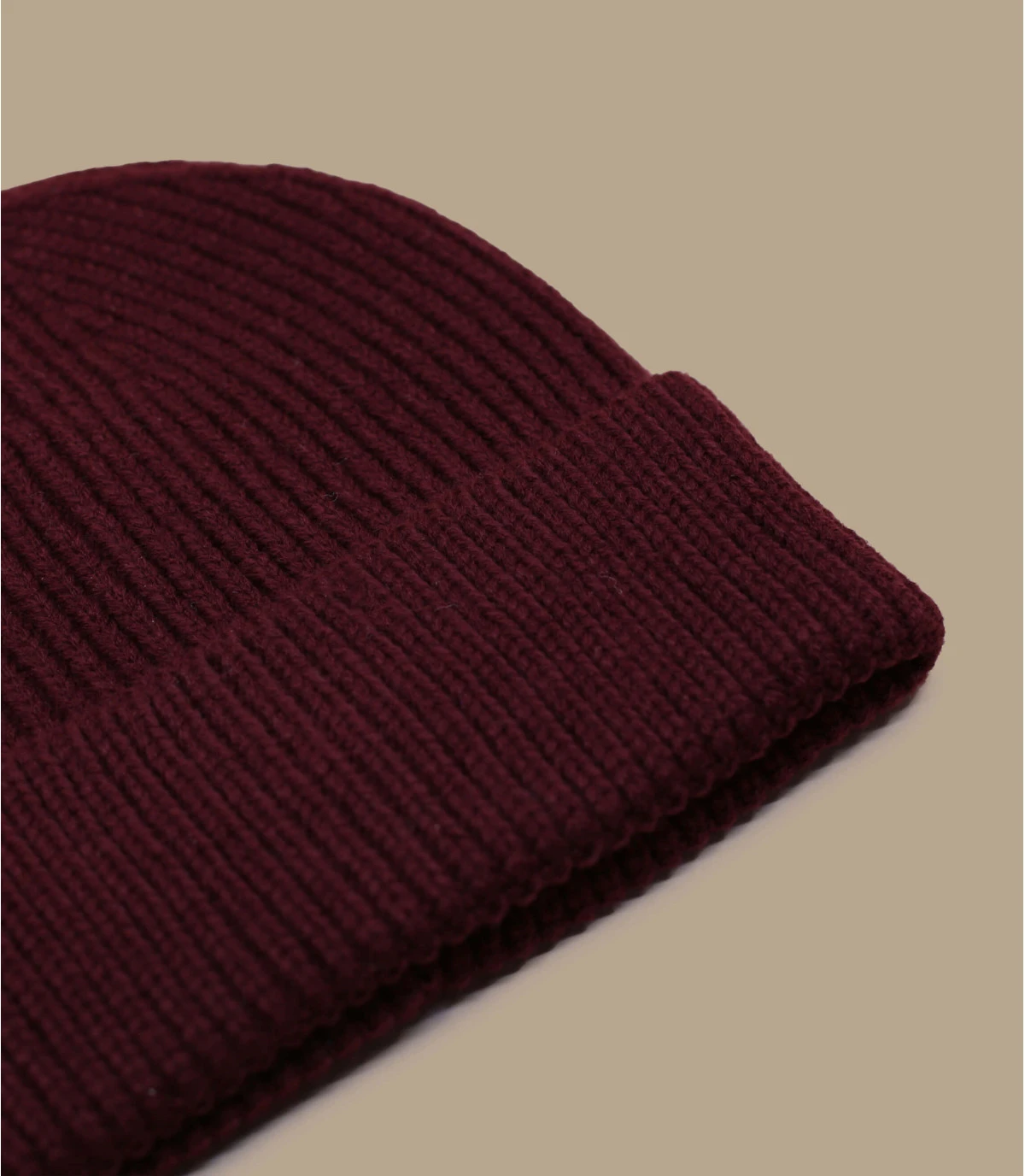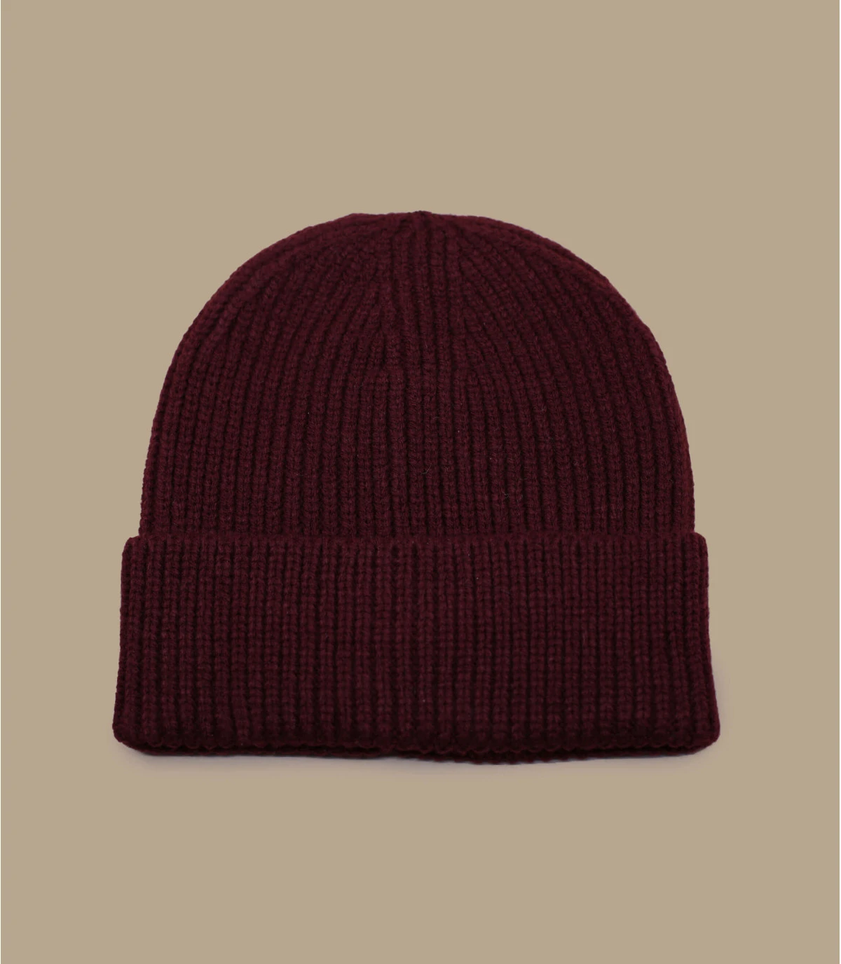 Bonnet revers en maille acrylique de couleur bordeaux. Taille unique : 55-60 cm de tour de tête.