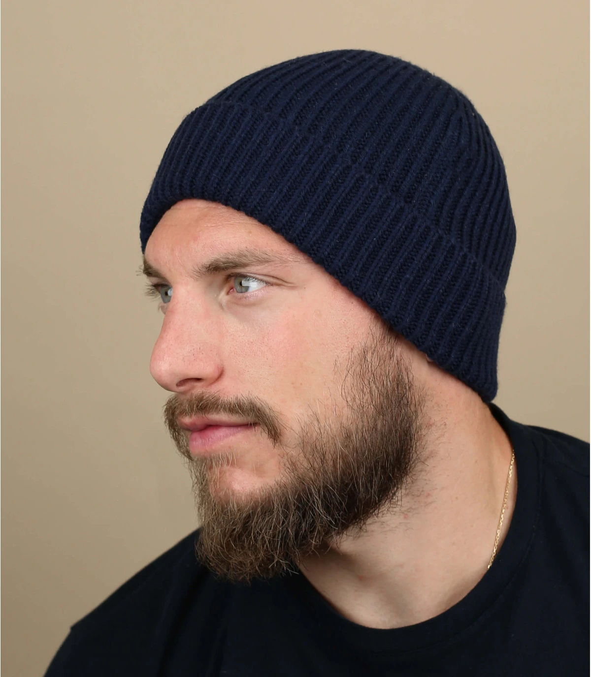 Bonnet revers en maille acrylique de couleur bleu marine. Taille unique : 55-60 cm de tour de tête.