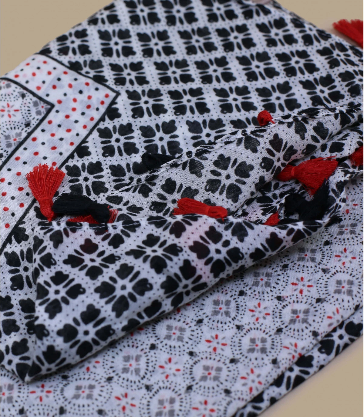 Ce foulard, passe-partout, élégant et douillet, risque de ne plus jamais vous quitter ! Vous allez apprécier son imprimé de losanges noir et blanc envoûtant, et aux extrêmités ses pompoms rouge et noir élégants. À porter avec tout !