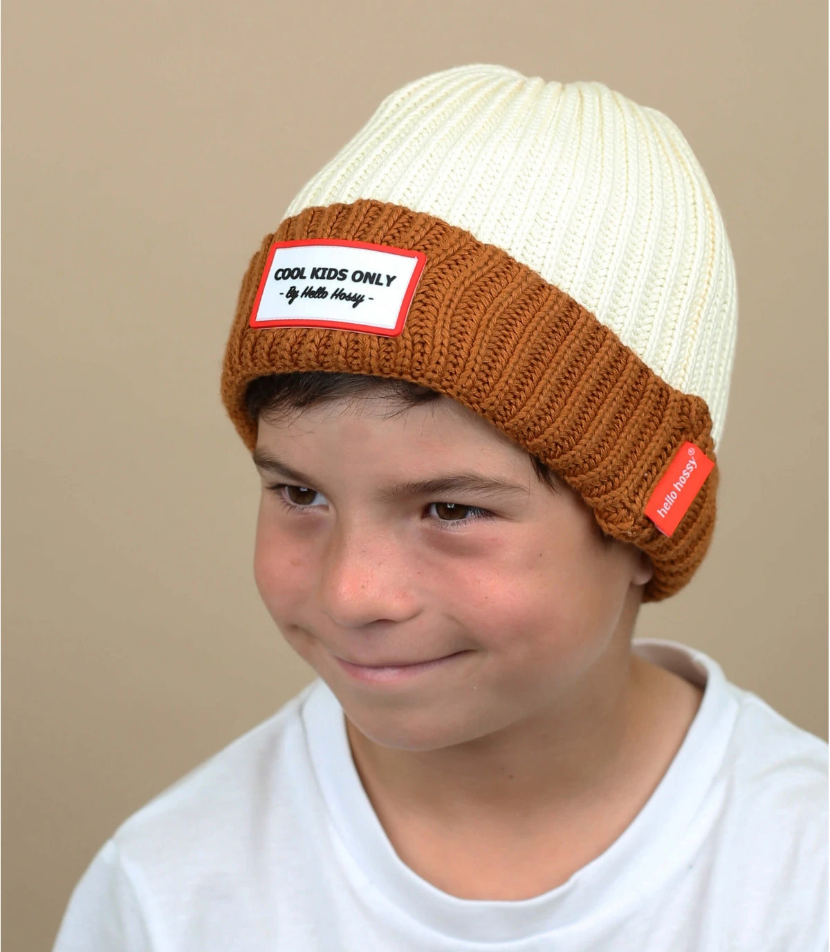 En tricot à côtes de coton bio respirant et doux, ce sympathique bonnet écru avec un revers marron est complété d’une originale étiquette Cool Kids Only.