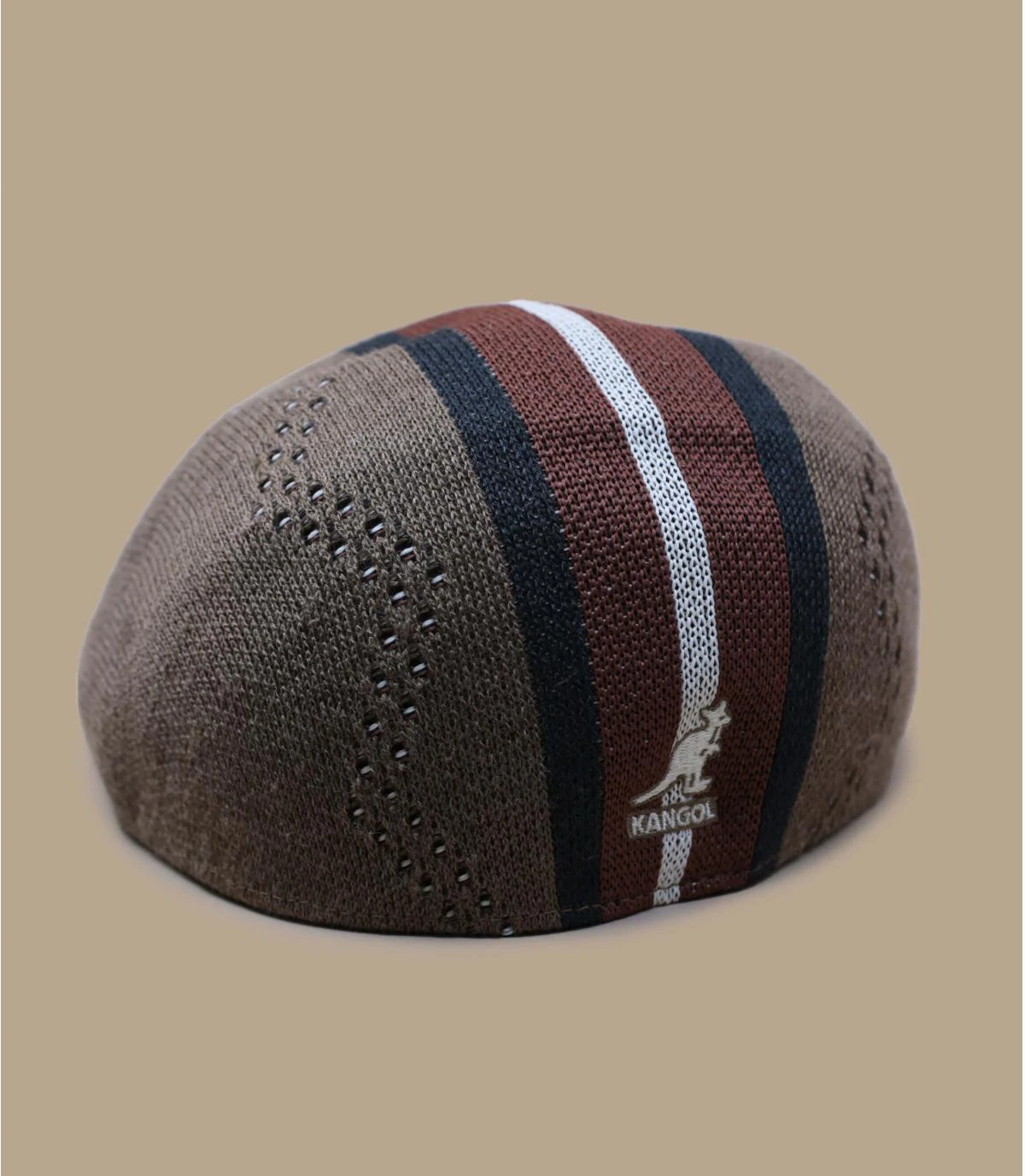 Le béret 507 est une casquette plate qui fait partie des styles originaux de la marque Kangol. Ce modèle de couleur camel est décoré de rayures sur le dessus et sa maille forme un zigzag aéré.