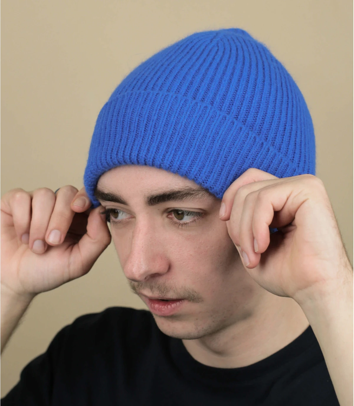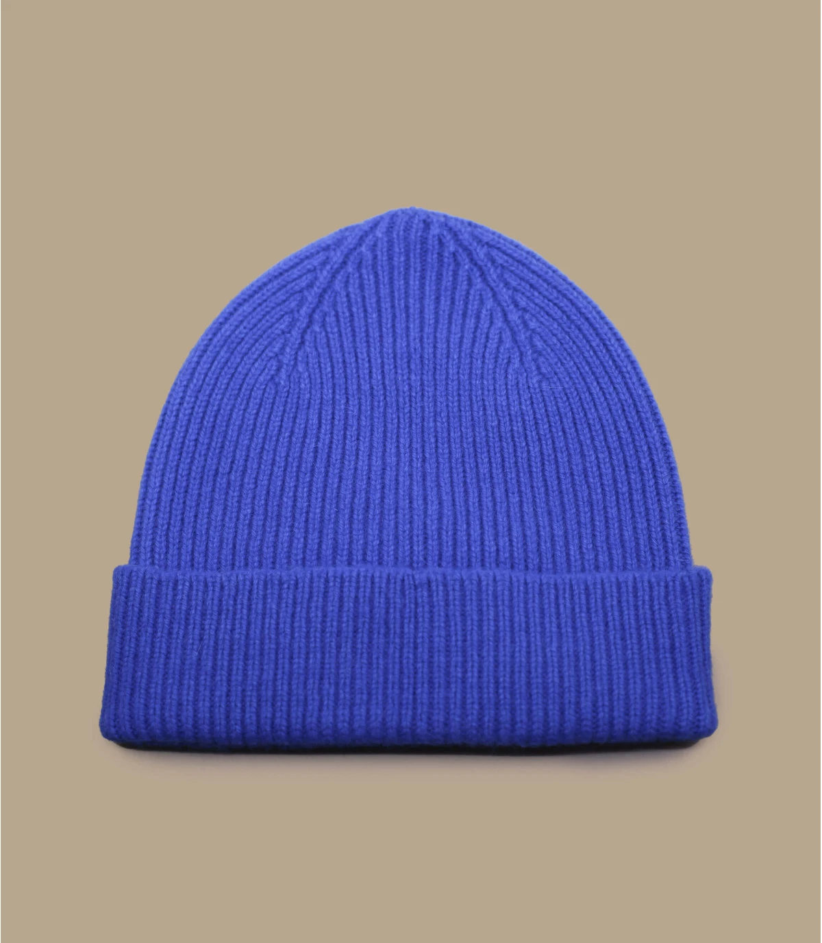 Ce bonnet à revers en laine bleu a été fabriqué dans l’une des plus vieilles usines de filature en Ecosse selon un savoir-faire traditionnel. Il est fait en laine d’agneau et en laine Angora certifiée de production responsable.