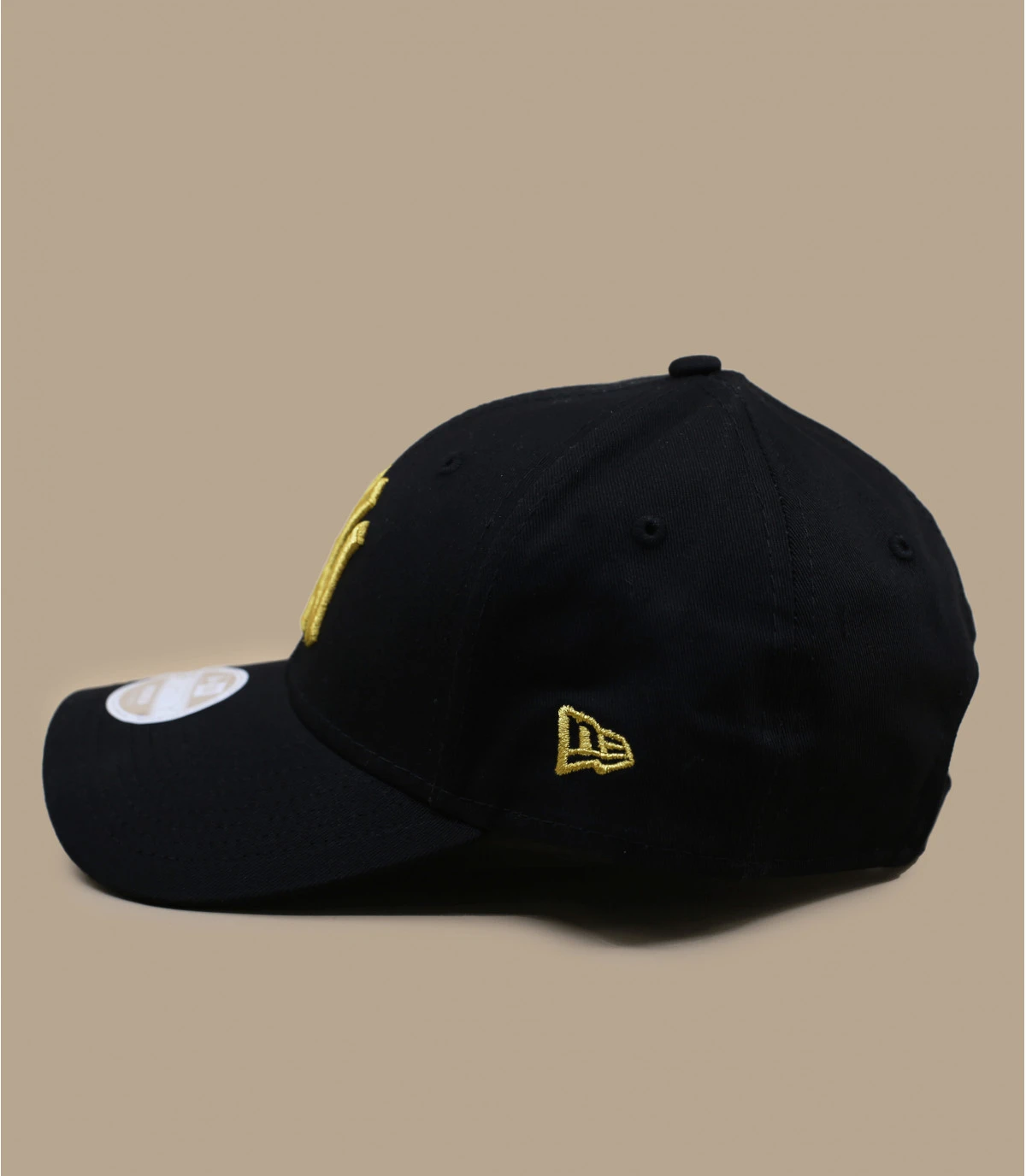 New Era a crée une collection de casquette pour femme tout en gardant sa patte inimitable. Sur ce modèle noir à visière curve, les initiales NY sont brodées en couleur or pour un contraste détonant.