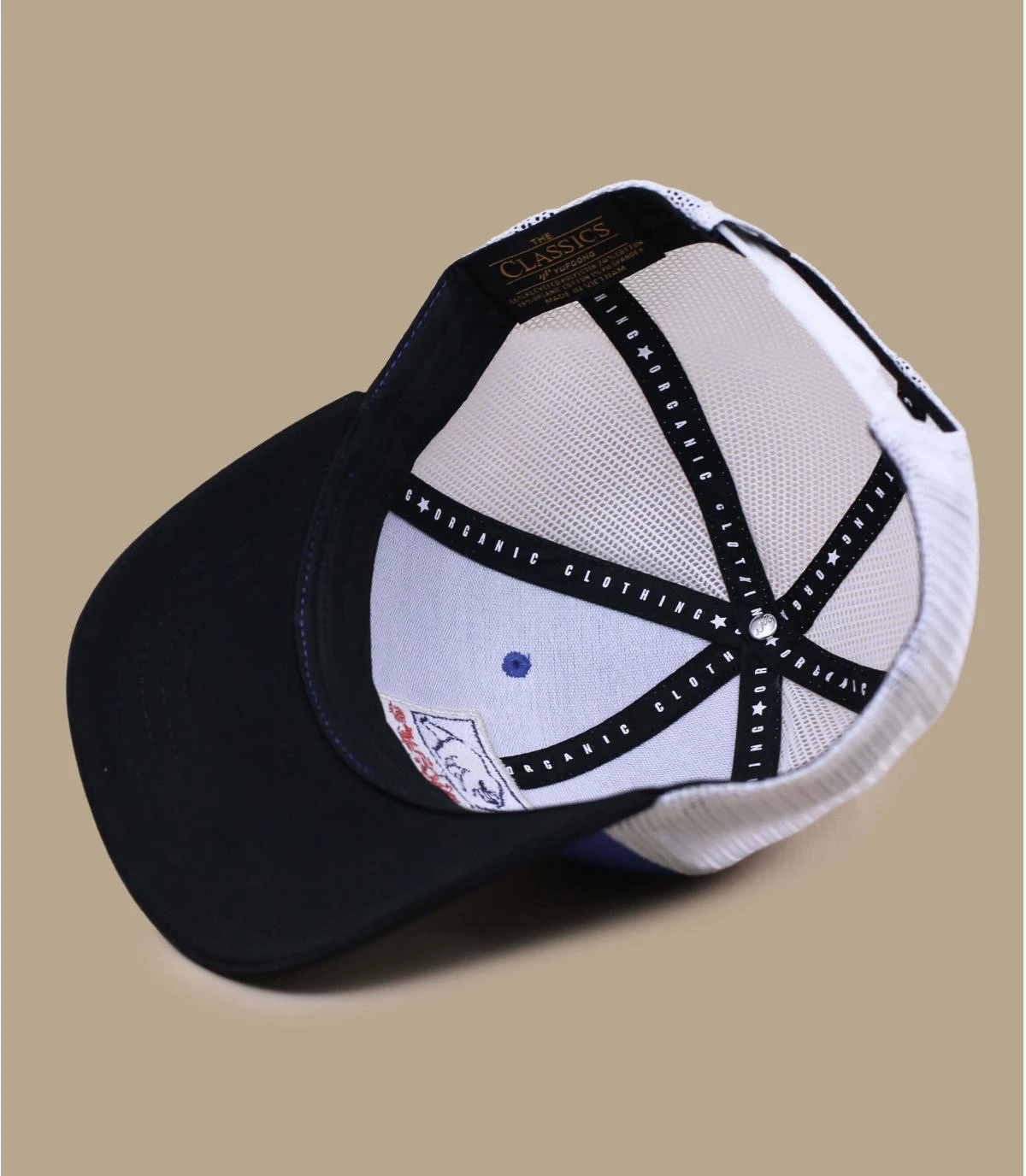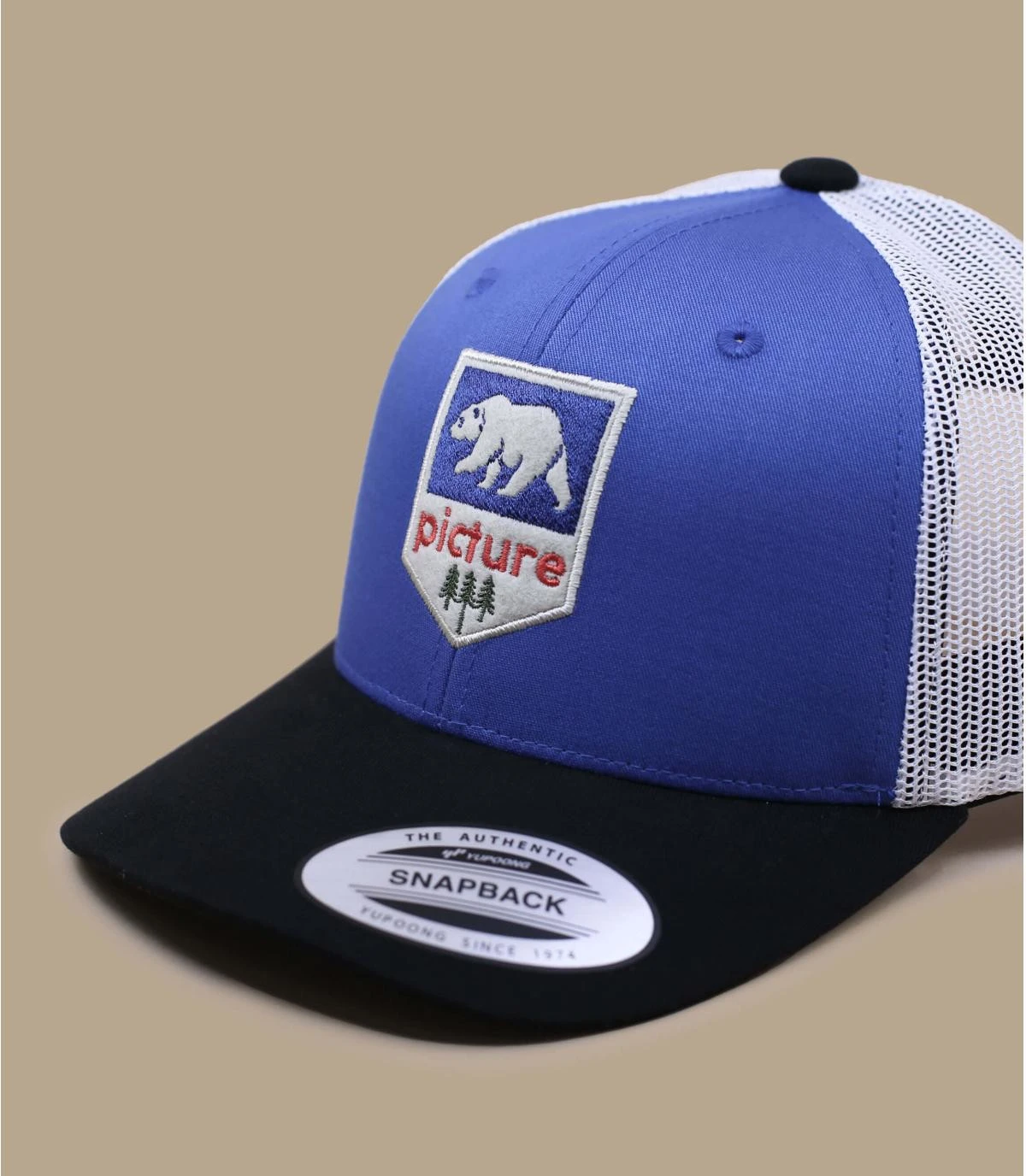 Cette casquette trucker pour enfant tendance a une conscience écologique. Elle est bleu à l’avant avec une visière noire et un filet blanc et faite en coton organique certifié. Un écusson vintage montre la marque avec un dessin d’ours.