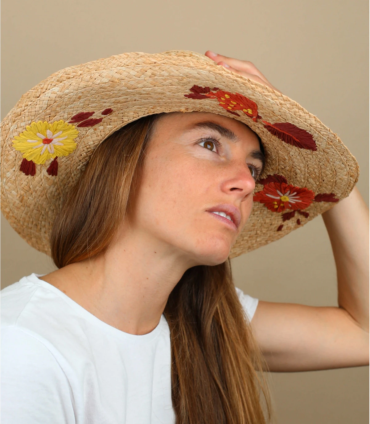 En portant cette capeline fleurie en paille cet été, vous serez très féminine. De couleur miel, sa paille est souple et son style très frais. Des fleurs sont brodées sous le bord et un ruban jaune entoure la calotte.