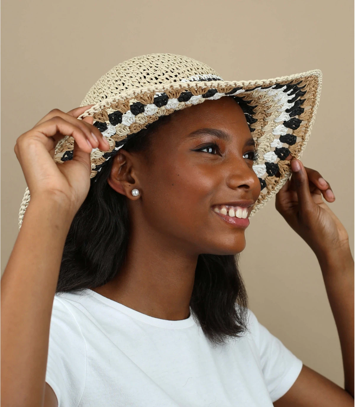 Relaxez-vous en toute sérénité au soleil avec cette capeline en paille élégante. Son tressage souple est respirant avec des tresses de couleur marron, blanc, beige et noir. La capeline est le modèle idéal pour vous protéger lors de vos longues sessions de soleil.