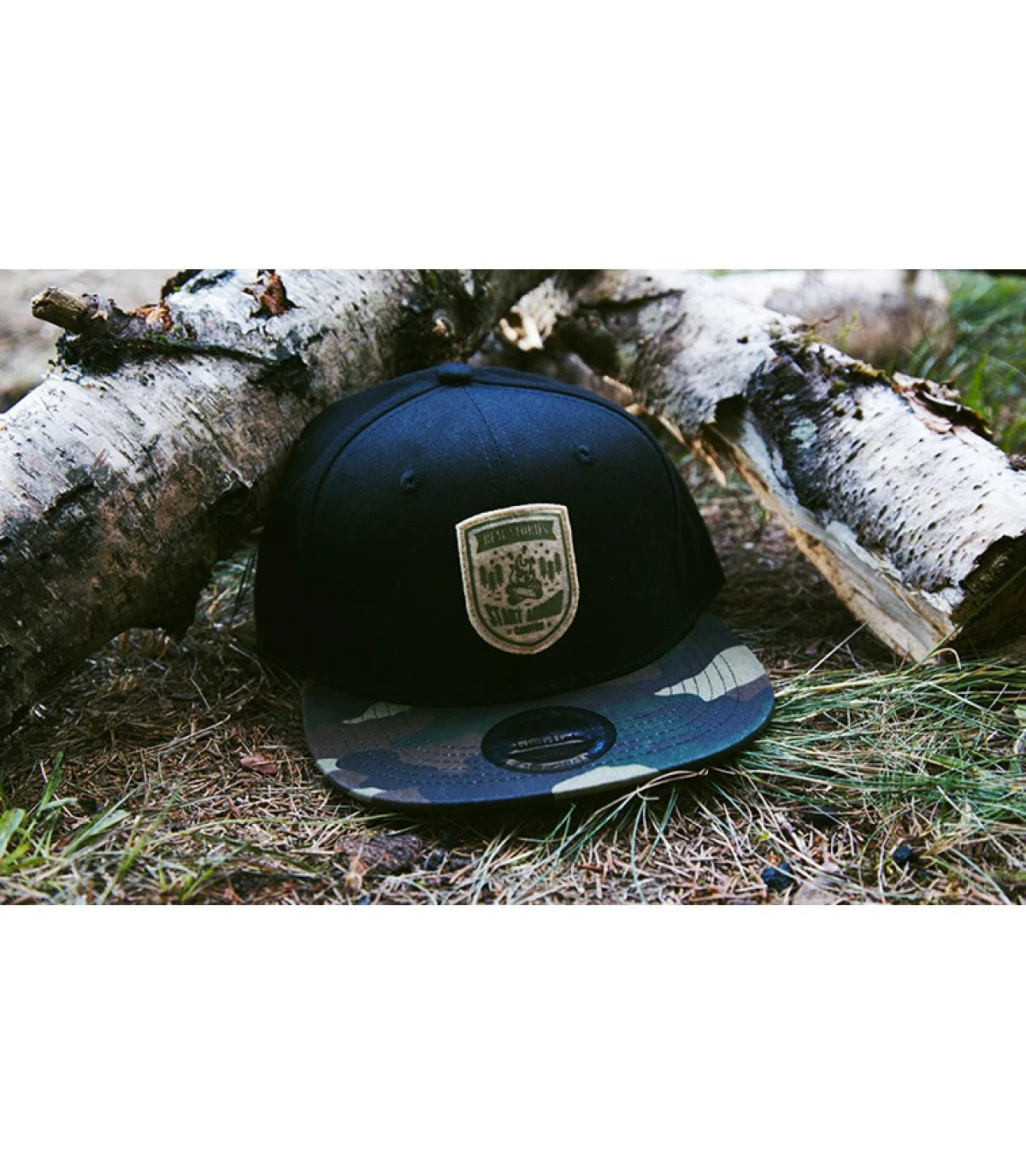 Les meilleures histoires se racontent autour d’un feu de camp, à moins que tout ne commence à ce moment-là… Cette superbe snapback noire à visière camo nous régale avec son patch exclusif pour Headict. Il est en feutrine beige imprimée kaki et son joli design rétro nous donne envie de passer plus de temps dehors.
