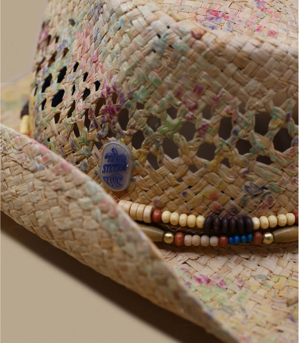 Plongez dans une ambiance de western avec ce chapeau d’été pour femme au style cowboy. Il est fait en paille raphia de couleur naturelle. Il est perforé sur la couronne pour un effet encore plus sauvage et décoré de colliers de perles.