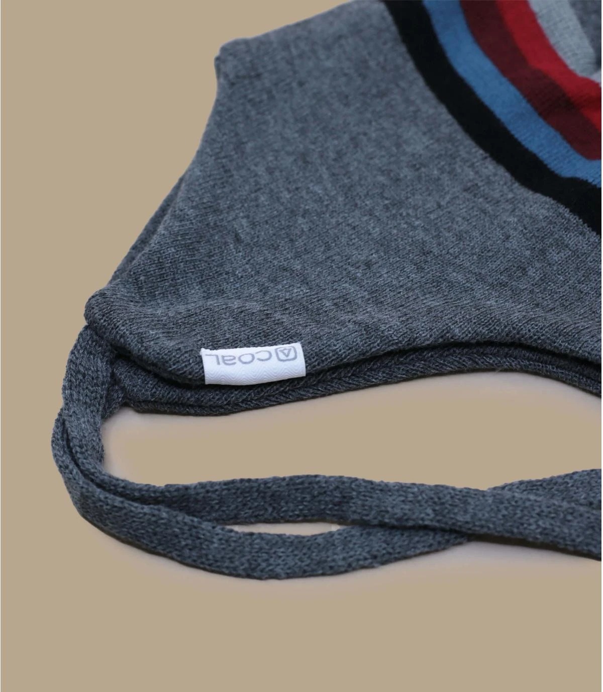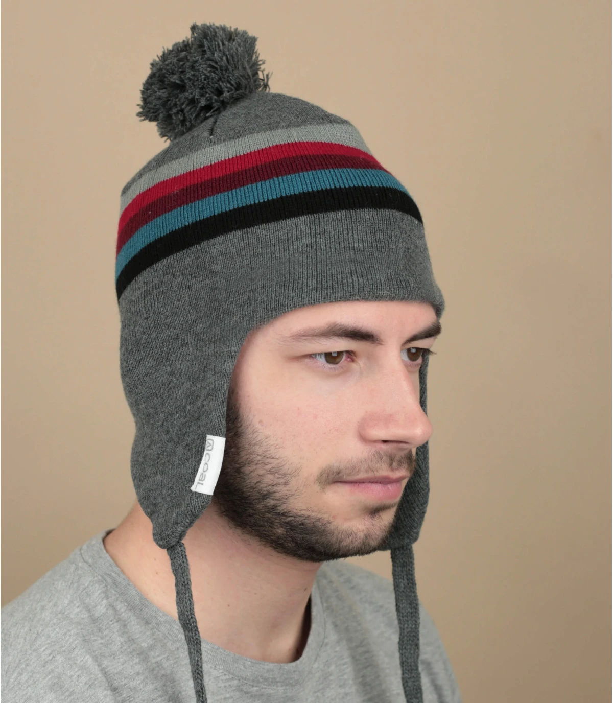 Portez ce bonnet hybride de style péruvien qui est à la fois un bonnet classique avec un pompon détachable et aussi un cache-oreilles muni d’un cordon d’attache. Son coloris est gris avec des bandes de couleur rouge et bleu.