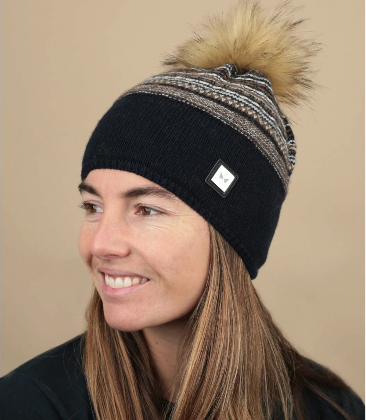 Craquez pour ce bonnet à pompon pour femme bleu marine avec un joli motif éco-responsable ! Il est fabriqué en Italie à partir de différentes fibres toutes recyclées. Il est doté d’un pompon en fausse fourrure généreux.